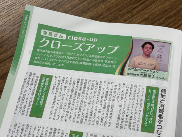 「産地と消費者をつなぐ!鹿児島のイイモノを全国へ」という見出しのもと、代表・大薗の起業の経緯や「かごしまぐるり」のサービスにかける想いが掲載されています。