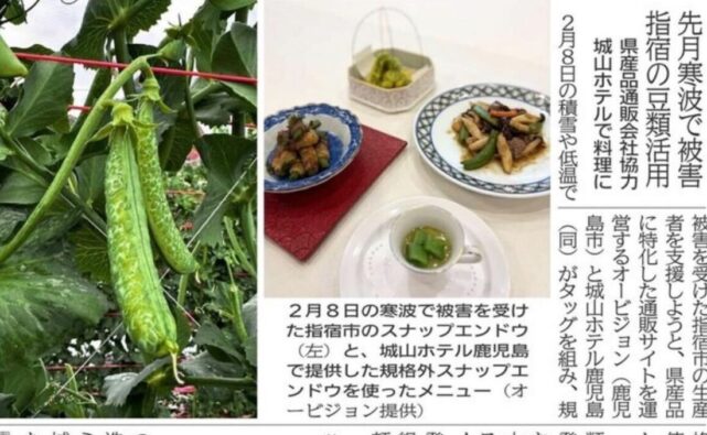 - 取り組みの背景: 2月8日の積雪や低温により、指宿市の特産品であるスナップエンドウに「しおれ」や「霜ざや」が発生し、味や品質に問題がないものの規格外となってしまった現状を受け、生産者支援を目的にスタートしました。